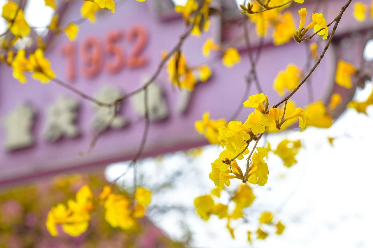 走进邮电支路,抬头望去,道路两旁的黄花风铃木正值盛花期,团团簇簇的金黄色花朵挂满枝头,宛如万千风铃在春风中摇曳,作为一种会随着四季变换风貌的树种。