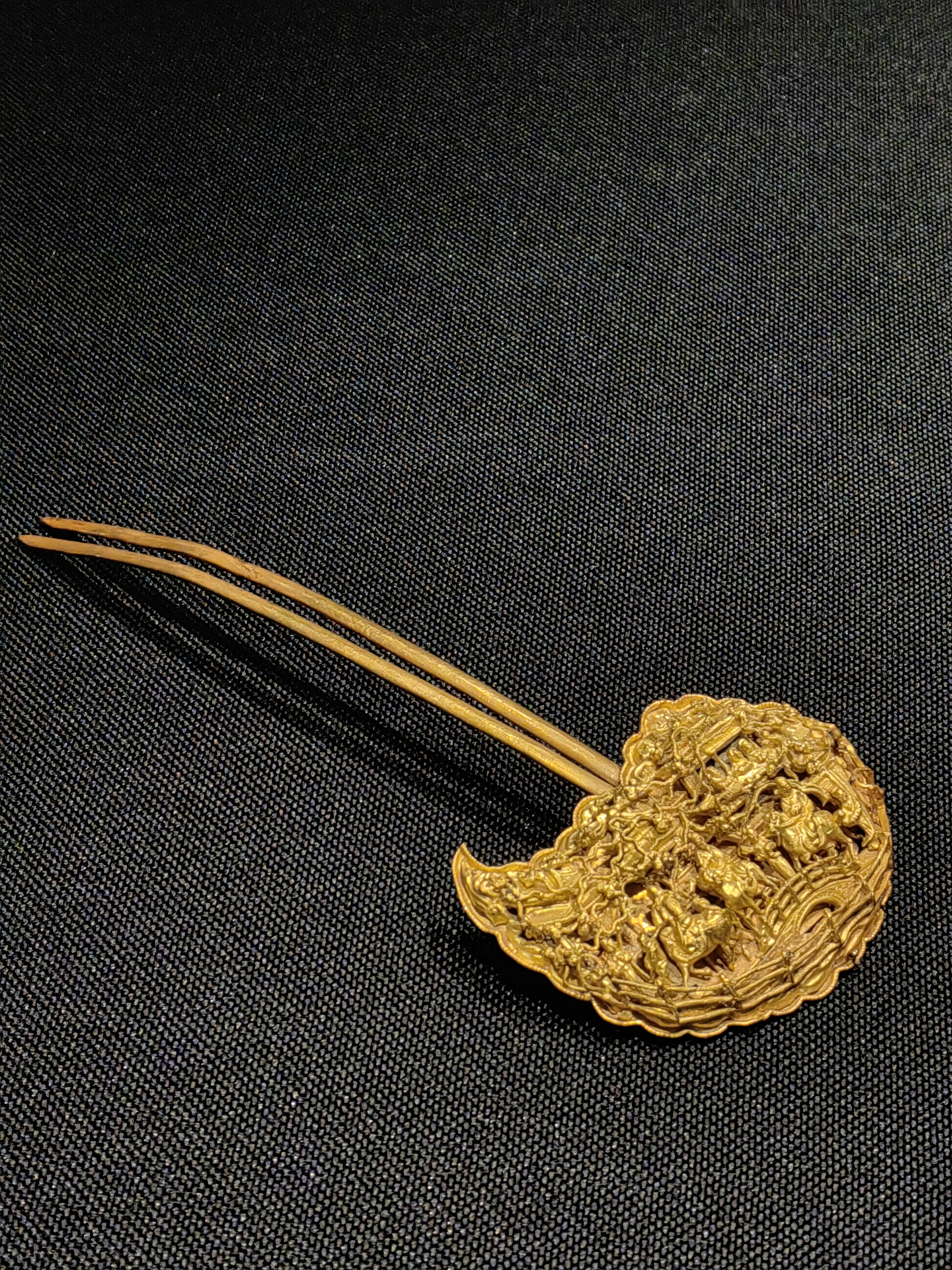学者扬之水依据其纹样与铭文,推断其为“瀛洲学士图”题材,源自唐太宗设十八学士的典故。此类云朵造型的金钗在明代又称掩鬓,插戴于两鬓,兼具装饰与吉祥寓意。