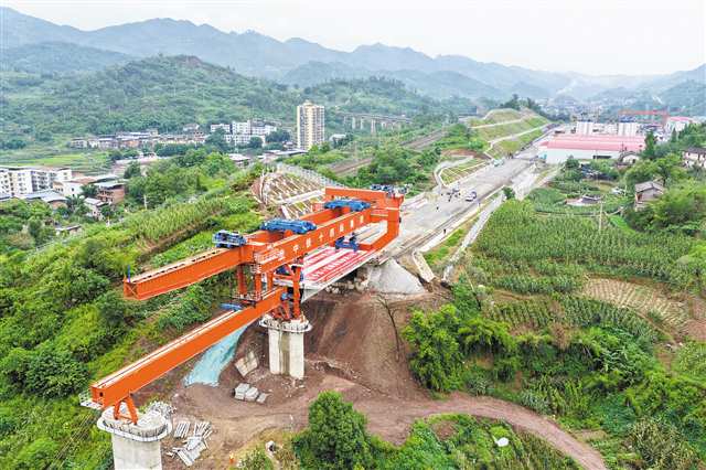7月10日10时许,首孔长24.6米、重约542吨的箱梁稳稳落在西渝高铁重庆段陈家沟特大桥第1孔桥墩上,这标志着西渝高铁重庆段箱梁架设施工正式启动,为全线按期建成通车奠定坚实基础。