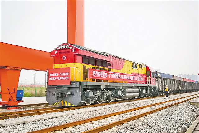 1月7日,一列满载有108台“重庆造”新能源汽车的铁海联运专列,从果园港鱼嘴站发出(右图),预计48小时后抵达广州南沙港,随后换装海轮运往中东市场。