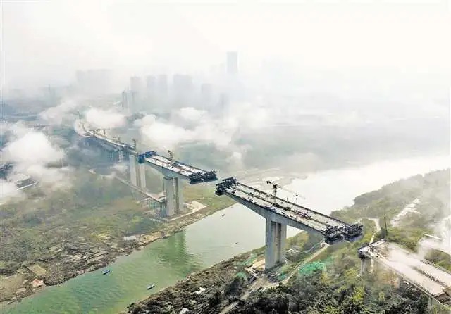 目前,黄桷沱长江大桥正在进行主梁结构拼装作业,共计63个节段,现已拼装至第19节段。
