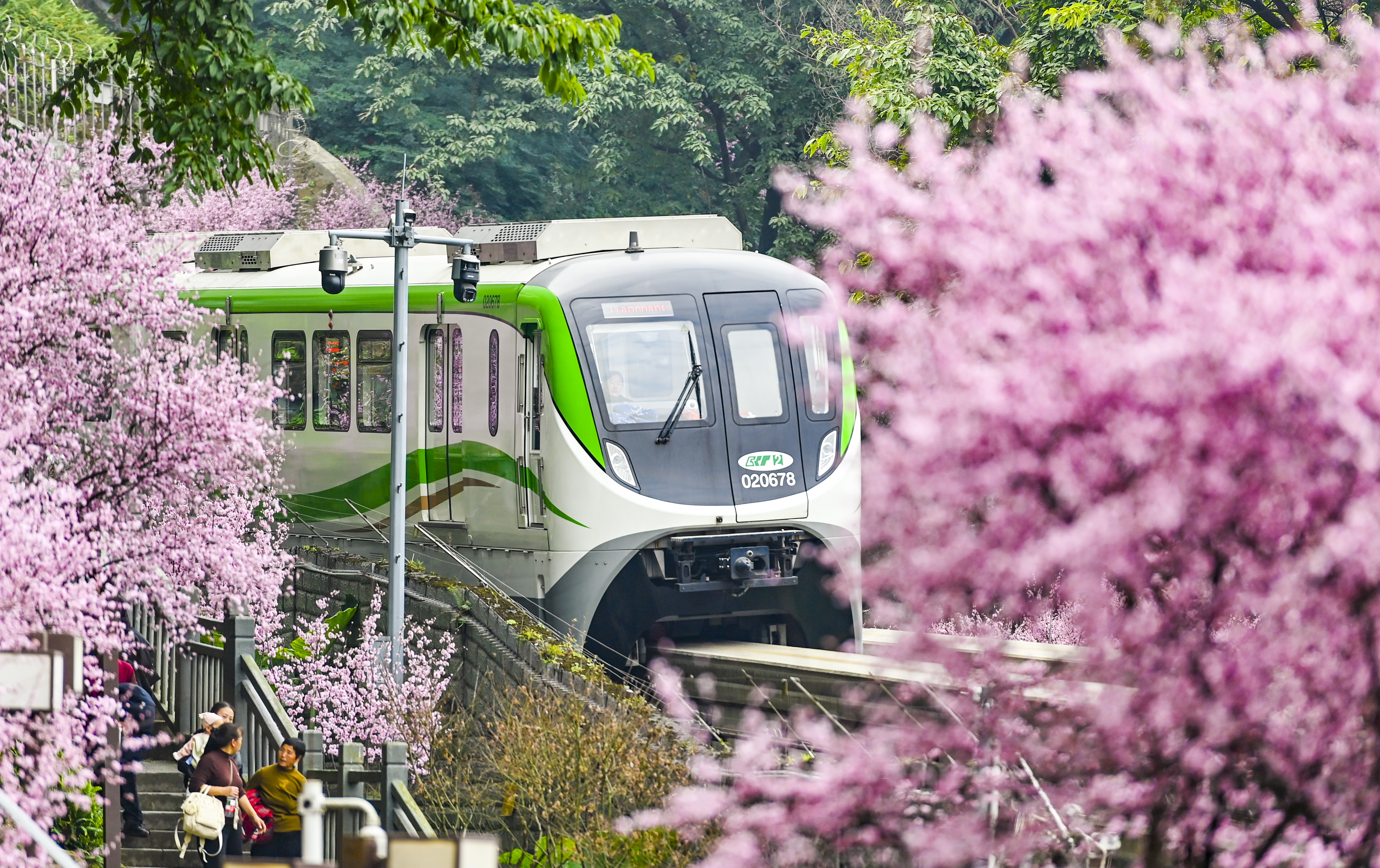 2月23日,重庆轨道交通2号线佛图关段,盛开的美人梅粉色花海与穿行其间的列车构成了一幅绝美的春日画卷,引得不少市民游客争相拍照打卡。记者 齐岚森 摄