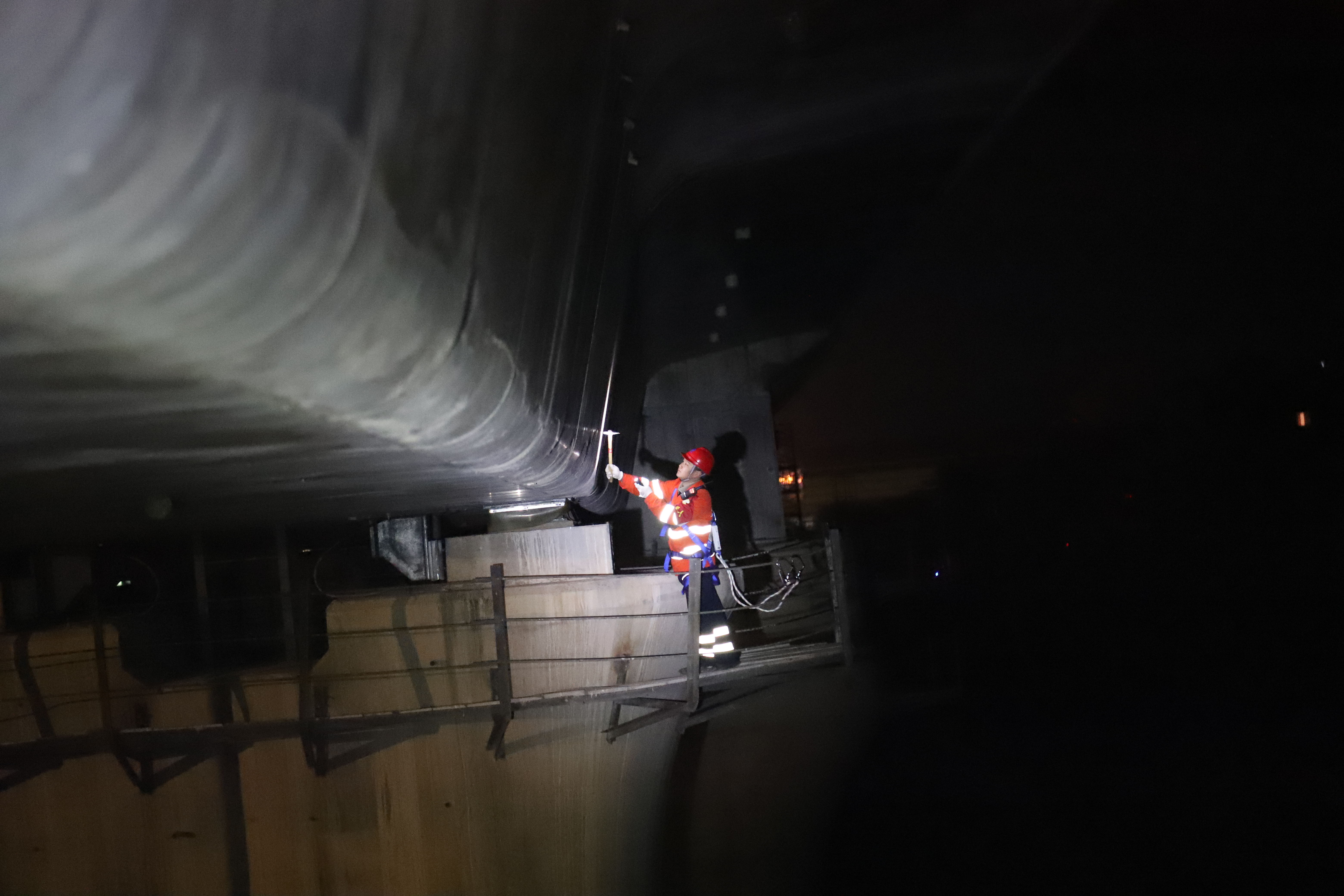 高空作业是此次检修的最大挑战,检修工作的第一站便是大桥的钢管拱结构。李纳和吴小龙一左一右,沿着钢梯稳步攀爬,手持检查锤逐点敲击,“叮叮当当”的敲击声在寒夜的江面上格外清脆。