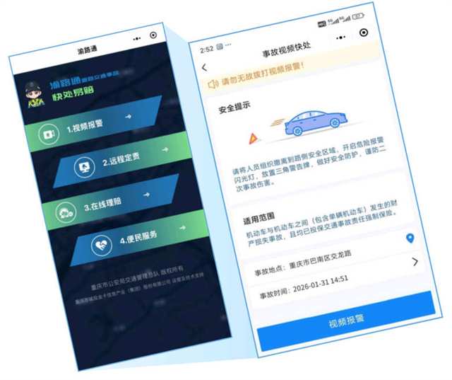 现在,发生交通事故后,通过“渝路通”微信小程序,直接连线辖区的视频快处中心,由中心接警员通过视频面对面指引车主视频采集事故情况等。