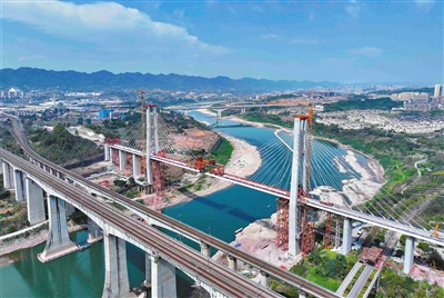 据现场施工单位有关负责人介绍,井口嘉陵江特大桥横跨沙坪坝区和两江新区,主桥全长1269米,是成渝中线高铁重庆枢纽段的重难点控制工程。目前,该工程已完成主塔封顶、边跨钢梁架设等关键节点,正在进行最后两个节段钢梁架设和斜拉索压锚施工,预计本月完成主桥合龙施工,为项目如期建成通车创造有利条件。