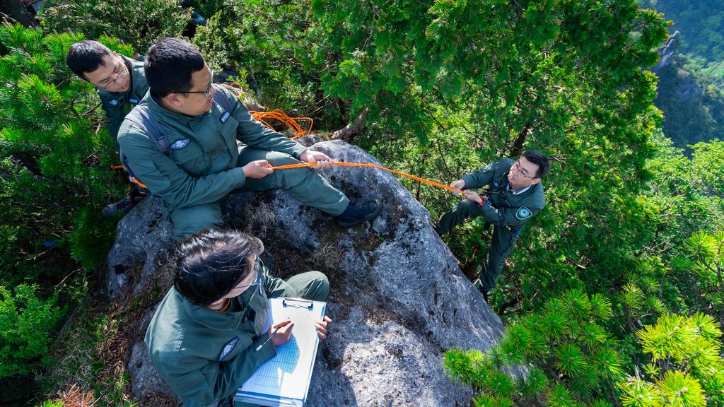 雪宝山青年科研团队在悬崖峭壁上开展崖柏资源普查。受访者供图