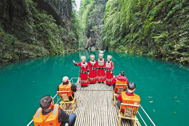 12月2日,彭水阿依河旅游景区,竹筏上苗族同胞正在高歌。记者 谢智强 摄/视觉重庆