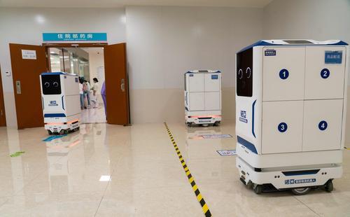 ▲2021年9月29日,重医附属儿童医院,送药机器人排队在药房取药,准备送往病房。记者 崔力 摄视觉重庆