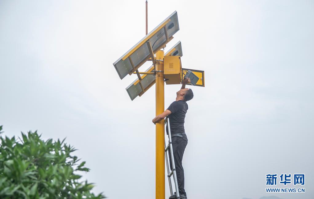 7月9日,在重庆市奉节县安坪镇,地质队员检查地灾隐患点的GNSS监测设备。
