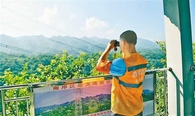8月9日,南岸区迎龙镇通基坡森林防火瞭望塔,护林队员正在通过望远镜瞭望明月山区域植被森林,筑牢持续高温下的森林安全防线。特约摄影 郭旭/视觉重庆