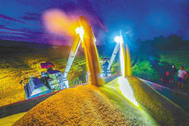 8月7日,长寿区葛兰镇盐井村村民在夜间抢收稻谷。连日来,村民们抓住高温天气,昼夜不停推进秋收进度,确保粮食颗粒归仓。通讯员 樊强 摄/视觉重庆