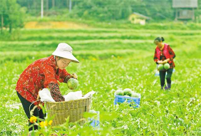 日前,石柱石家乡黄龙村的西瓜地里,村民们冒着高温采摘西瓜。这段时间高温持续,黄龙村的“冰糖”小西瓜迎来销售旺季。通讯员 谭万玲 摄/视觉重庆