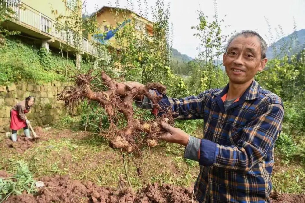 村民向记者展示刚挖出来的生长了5年的黄精。图源:石柱县融媒体中心