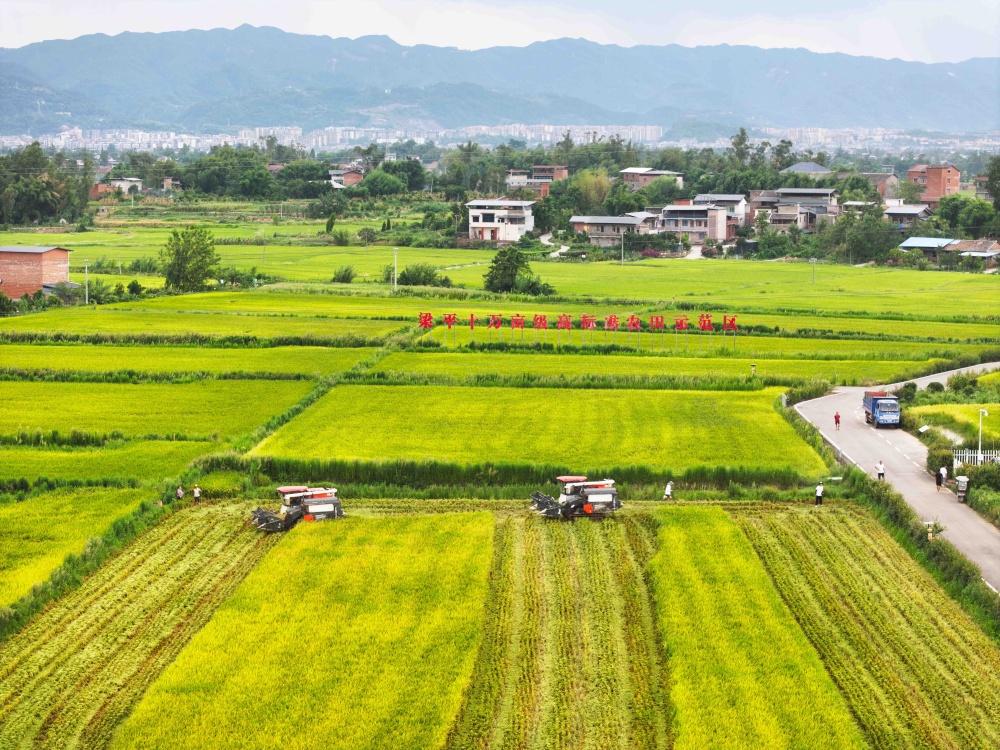 梁平区星桥镇两路村,梁平10万亩级高标准农田示范区,收割机在金黄色的稻田中收获水稻(无人机照片)。特约摄影 刘辉