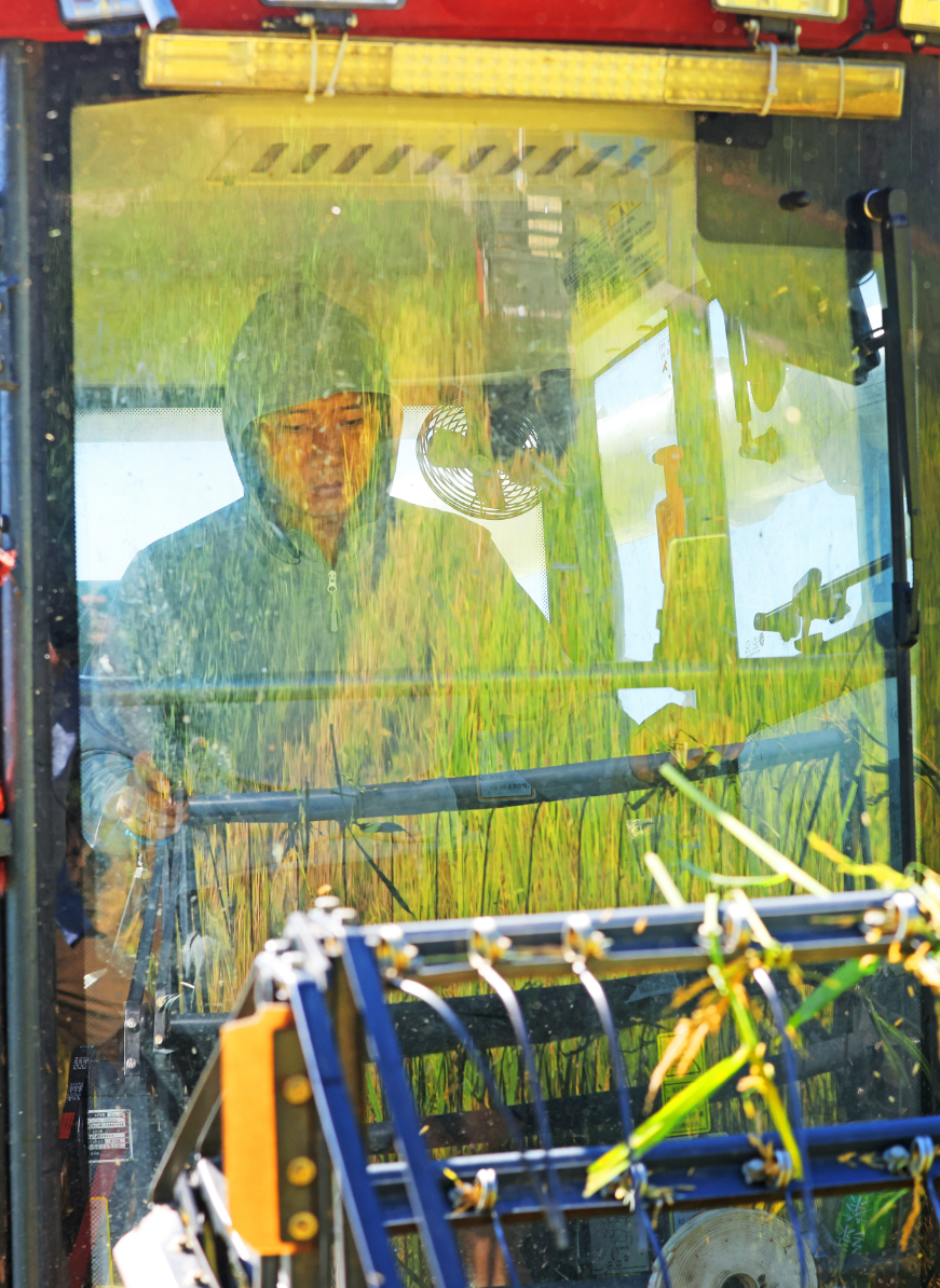 合川区玉河村,农机手正驾驶收割机收割“米粉稻”。特约摄影 钟志兵/视觉重庆