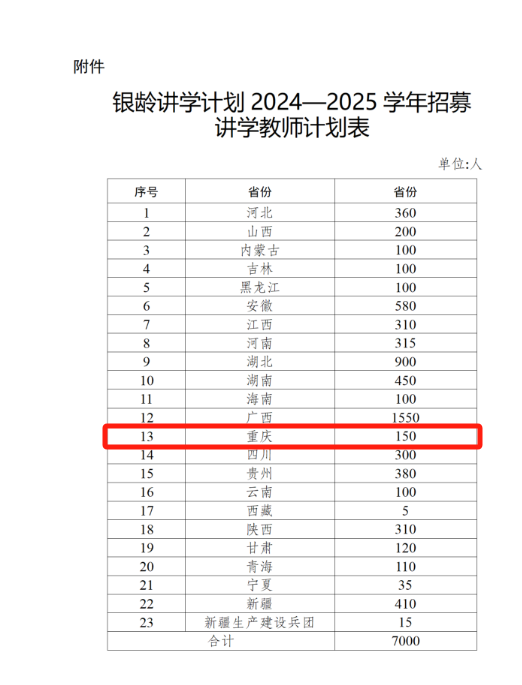 近日,教育部、财政部联合印发《关于做好2024年银龄讲学计划有关实施工作的通知》(以下简称《通知》),根据国家银龄教师行动计划整体部署,今年计划招募7000名银龄讲学教师,发挥优秀退休教师引领示范作用,支持农村地区教育发展。其中重庆将招募150名。