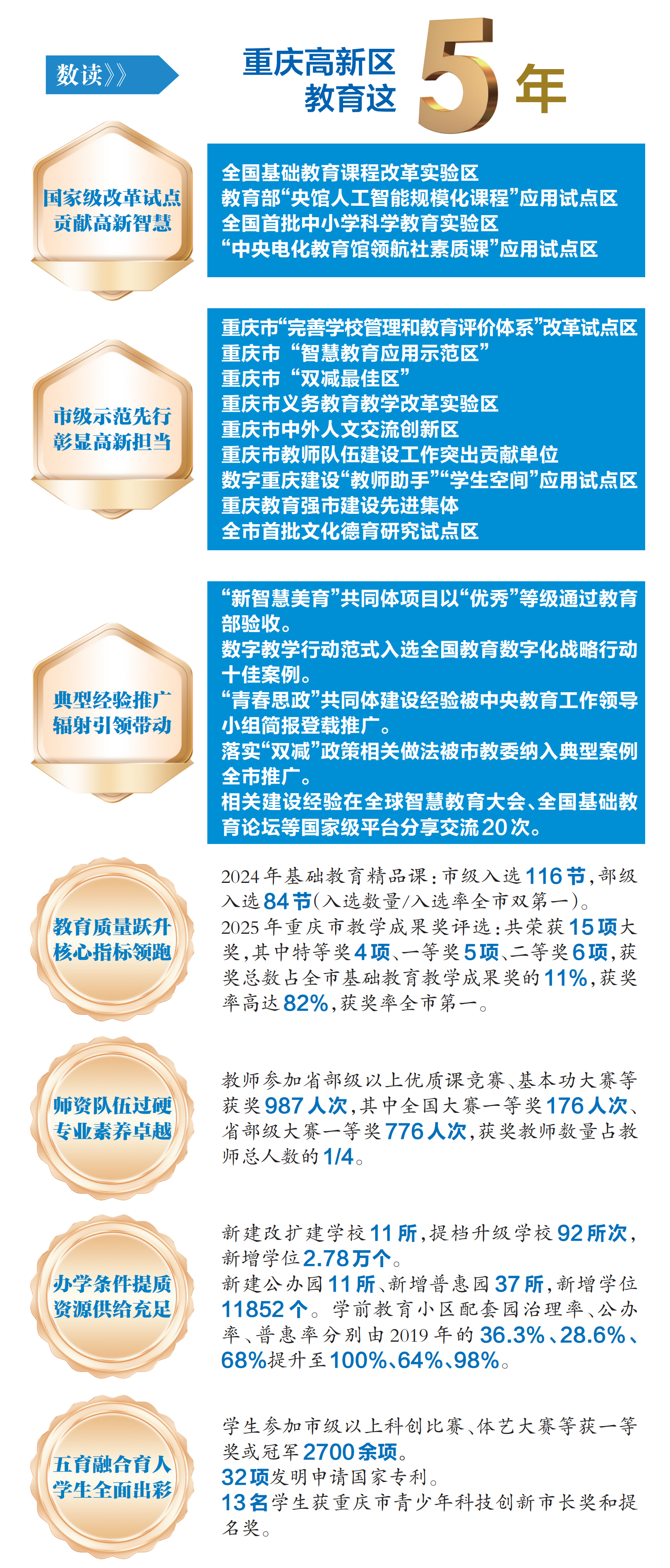 五年奋进,五年跨越。作为重庆教育强市先进集体,重庆高新区以实干担当,为落实教育强市战略提供了可操作的“高新方案”。