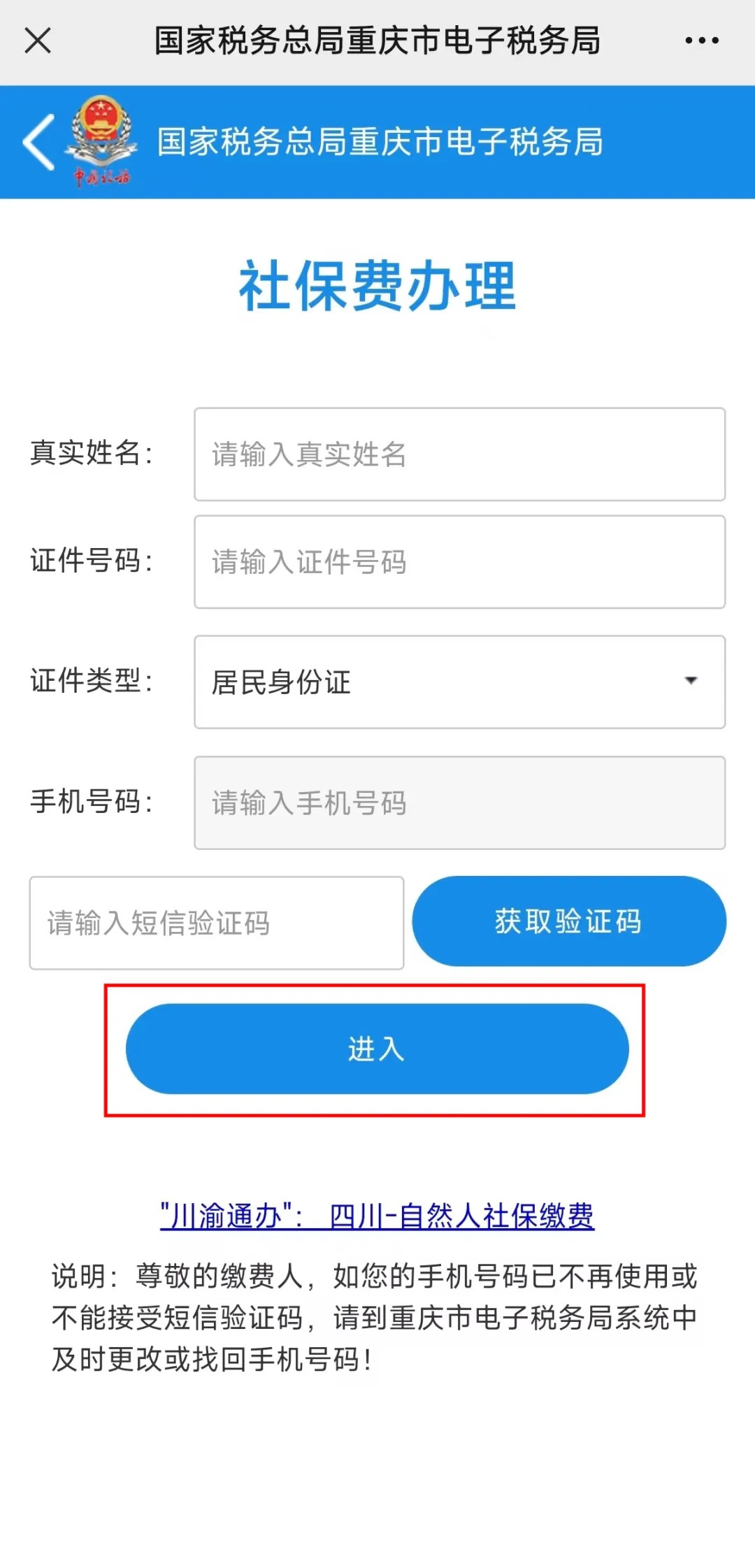 1.打开“重庆税务”微信公众号,点击页面底部【网上办税】-【个人社保】,依次输入经办人姓名、身份证号、手机号码、验证码等信息后,点击进入“社保费办理”页面。