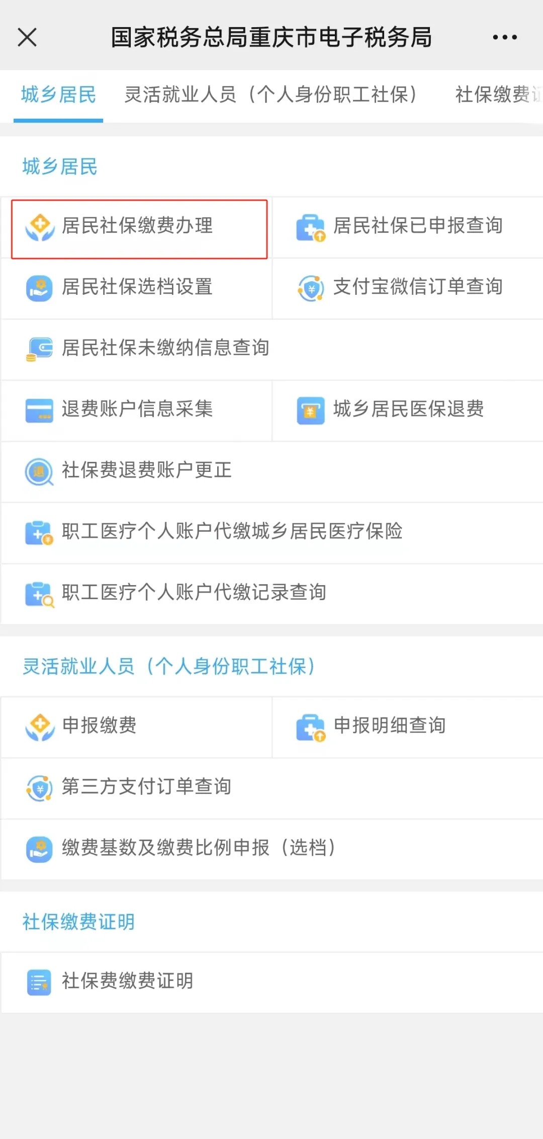 线上您可以通过“重庆税务”微信公众号、支付宝“重庆税务”生活号、“社保云缴费”微信小程序、云闪付等渠道缴费。线下可以到社保所、村委会(居委会)、办税服务厅等缴费。小编以“重庆税务”微信公众号为例,为您介绍缴费流程。