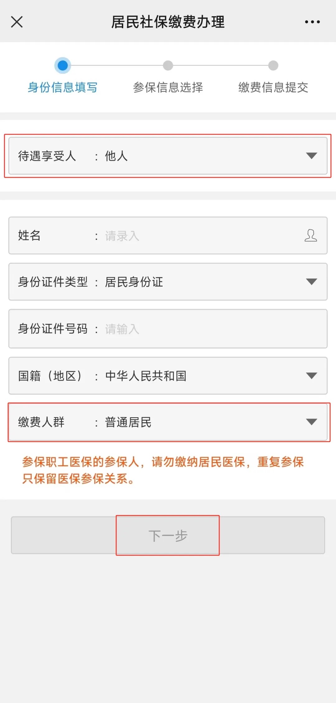 2点击【居民社保缴费办理】,“待遇享受人”选择【他人】,录入新生儿基本信息,“缴费人群”选择【普通居民】,点击【下一步】。