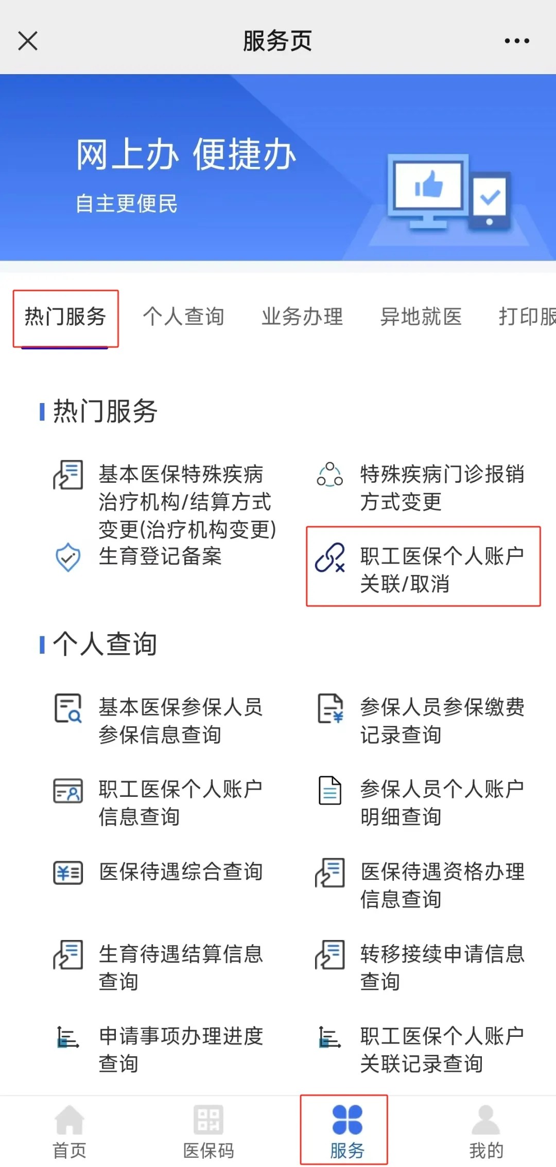 1.办理职工医保个人账户关联。登录 “重庆市医疗保障局”微信公众号,依次点击【服务大厅】-【服务】,点击【职工医保个人账户关联/取消】,按提示操作关联绑定个人账户。