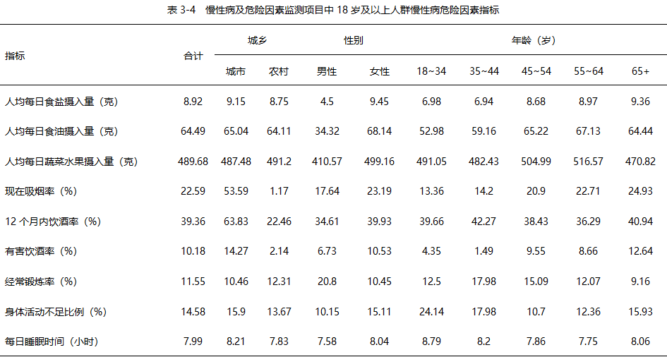 《报告》还列举了部分危险因素的数据,比如,现在吸烟率为22.59%,过去12个月内饮酒率为39.36%,有害饮酒率为10.18%。经常锻炼率为11.55%,身体活动不足比例为14.58%。平均每日睡眠时间为7.99小时。